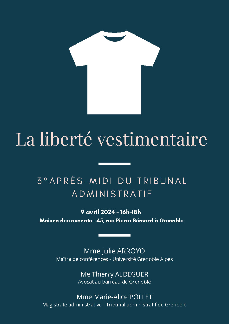 Le tribunal administratif de Grenoble organise la troisième édition de son cycle de conférence « Les après-midi du tribunal administratif », cette fois consacrée à la liberté vestimentaire. Cette conférence se déroulera le 9 avril 2024 de 16h à 18h à la Maison des avocats, 45 rue Pierre Sémard à Grenoble.