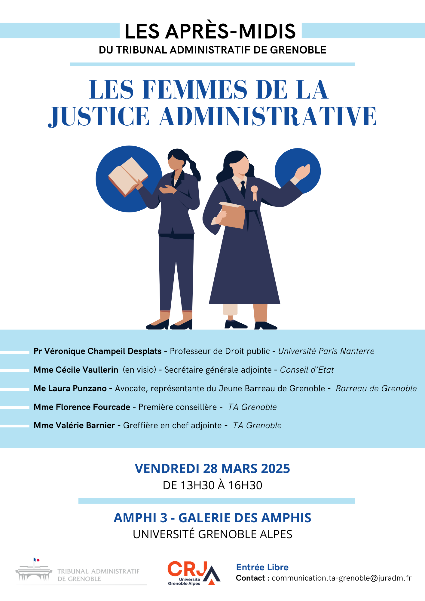 Le tribunal administratif de Grenoble poursuit son cycle des « Après-midi du tribunal administratif » visant à favoriser les échanges et la réflexion sur des thématiques juridiques d’actualité. Ces conférences, réunissant universitaire, avocat et membre du tribunal, permettent de mieux comprendre le fonctionnement de la justice administrative et les défis qu’elle rencontre. Dans cette perspective, et cette fois en collaboration avec le Centre de Recherches Juridiques (CRJ) de l'Université Grenoble Alpes, cette troisième rencontre de l’année est dédiée au rôle et aux parcours des femmes au sein de la justice administrative. Cette conférence mettra en lumière leurs contributions essentielles et ouvrira un débat sur leur place et leur évolution dans ce domaine.